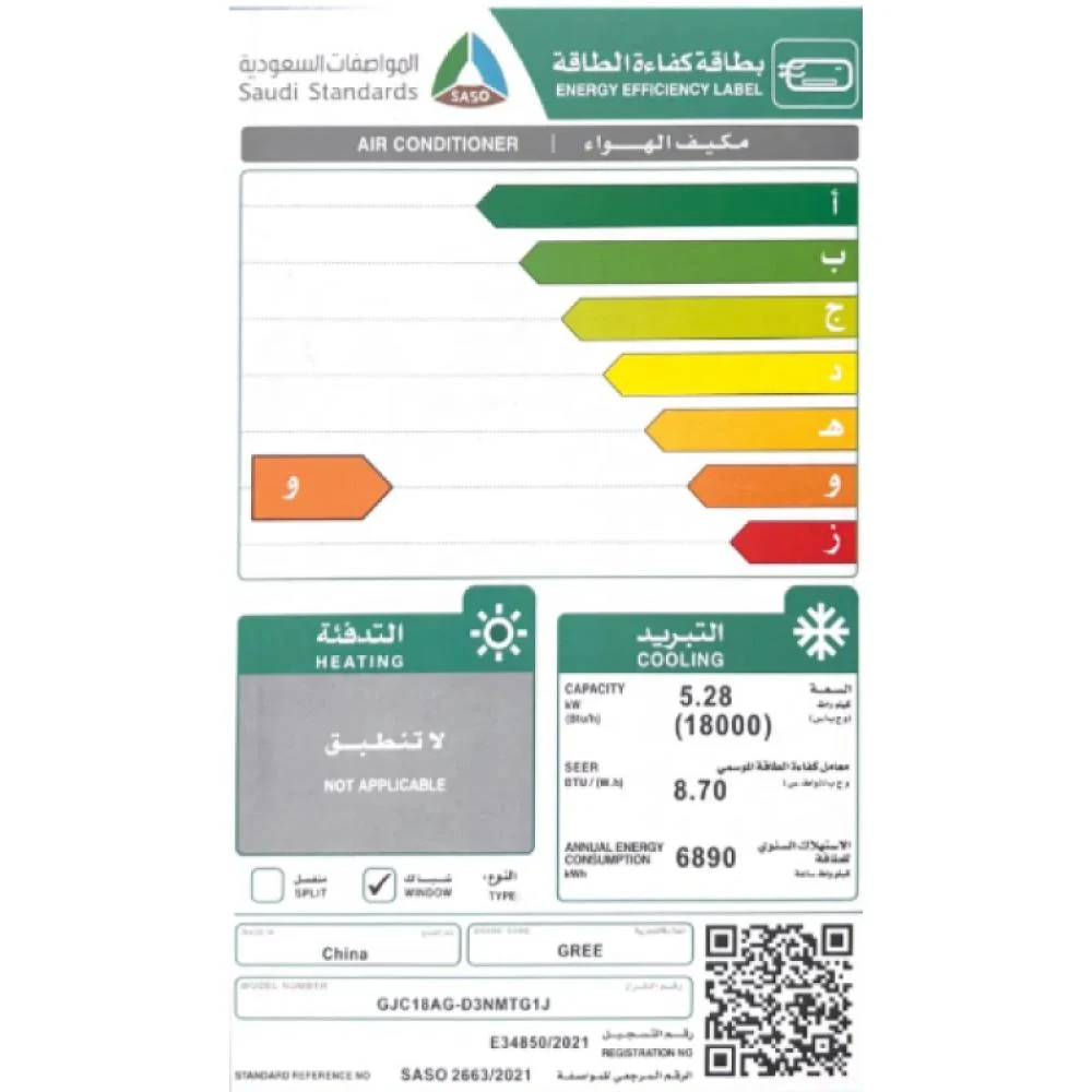 • السعة التبريدية: 18000 وحدة (1.5 طن)
